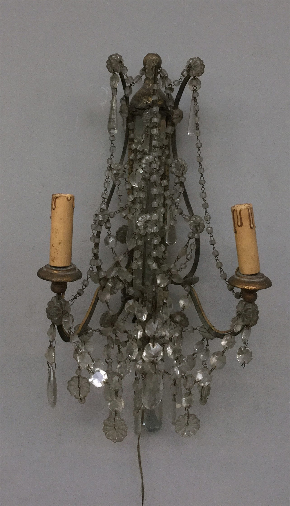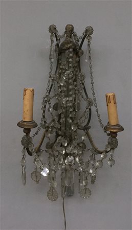 Antica applique a due fiamme in ferro battuto, sostegno in legno dorato con specchio, decorato con perline e pendagli in vetro; montato posteriormente a luce elettrica (h cm 42) (difetti)