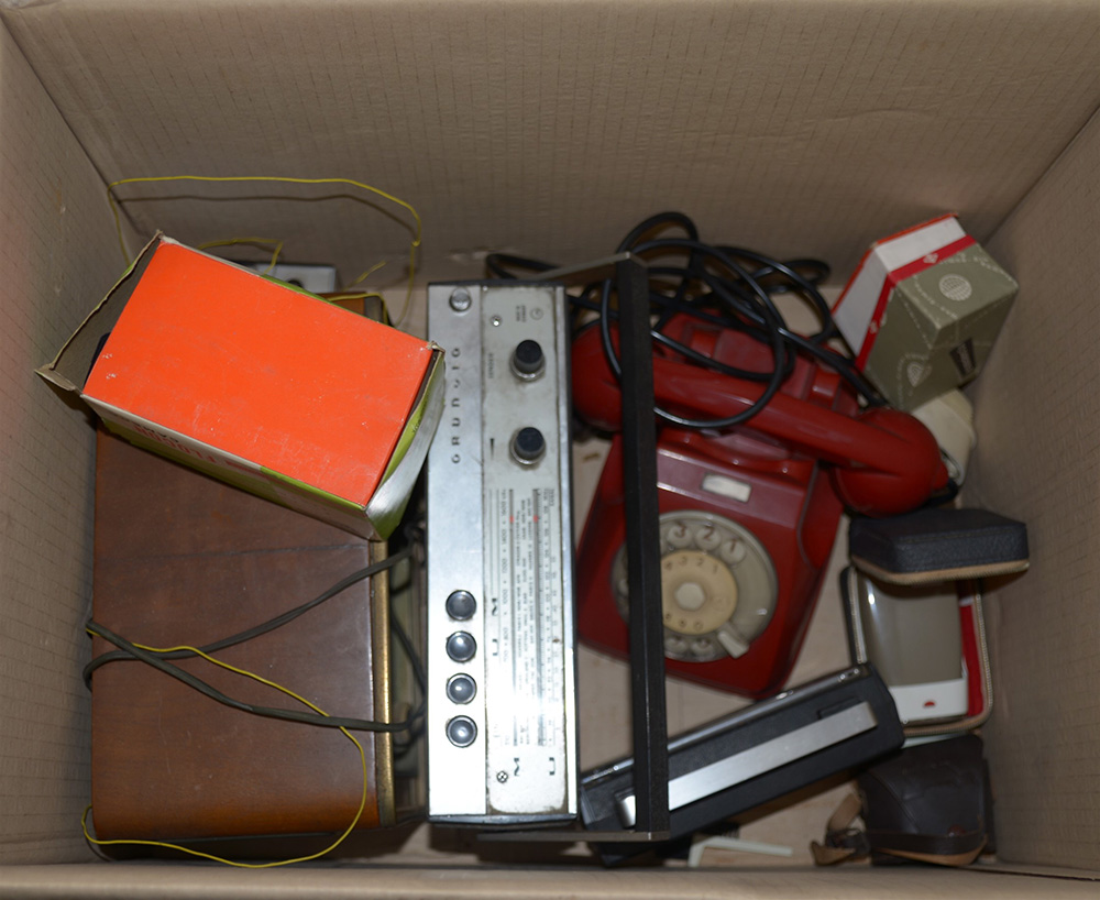 Cartone contenente un telefono a rotella, tre radio ed altri apparecchi di...
