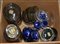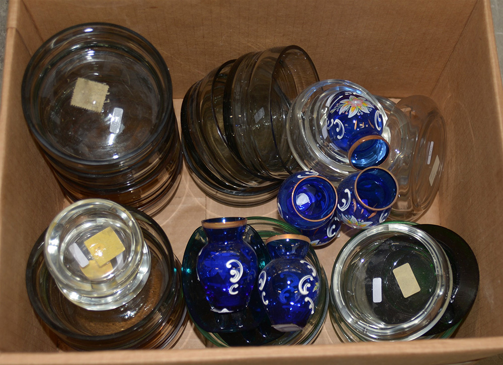 Lotto composto da un cartone contenente numerosi posacenere in vetro uniti a diociotto vasetti in vetro colorato