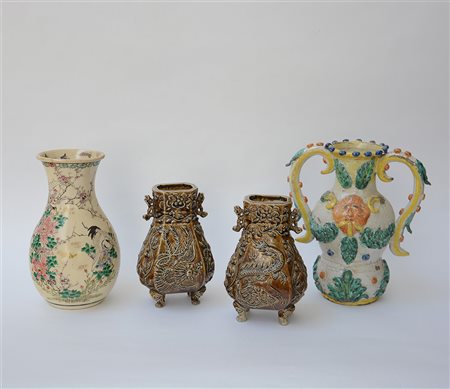 Manifatture diverse, lotto di quattro vasi diversi in ceramica policroma con decori in rilievo, misure diverse (difetti e restauri)