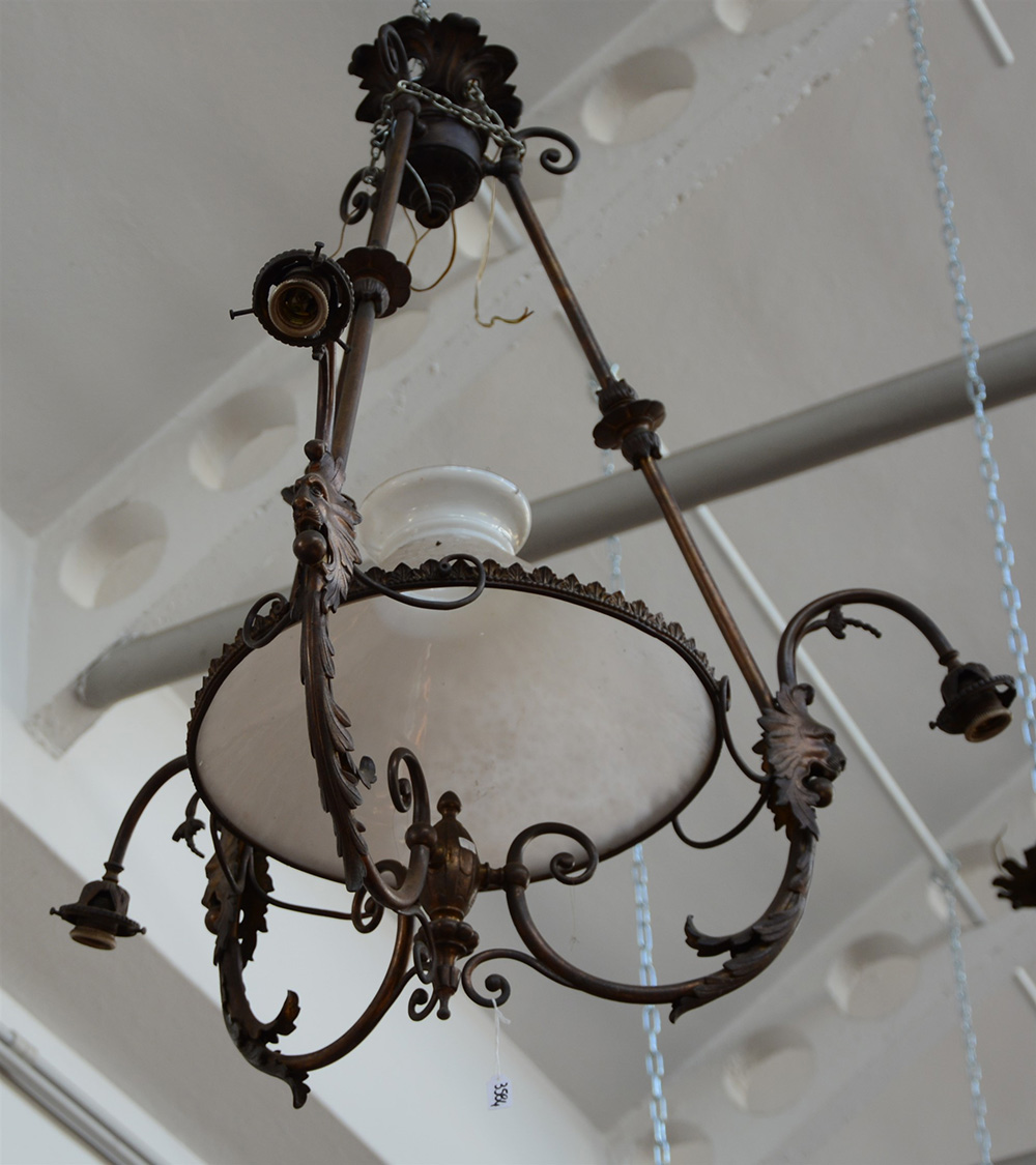 Lampadario a tre luci con struttura in bronzo a motivi vegetali e paralumi in vetro, primi decenni sec. XX (h cm 94) (difetti)
