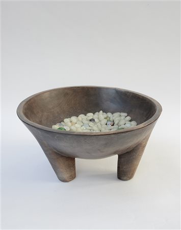 Coppa etnica in legno contenente oggettini in pietra dura e vetro (difetti)