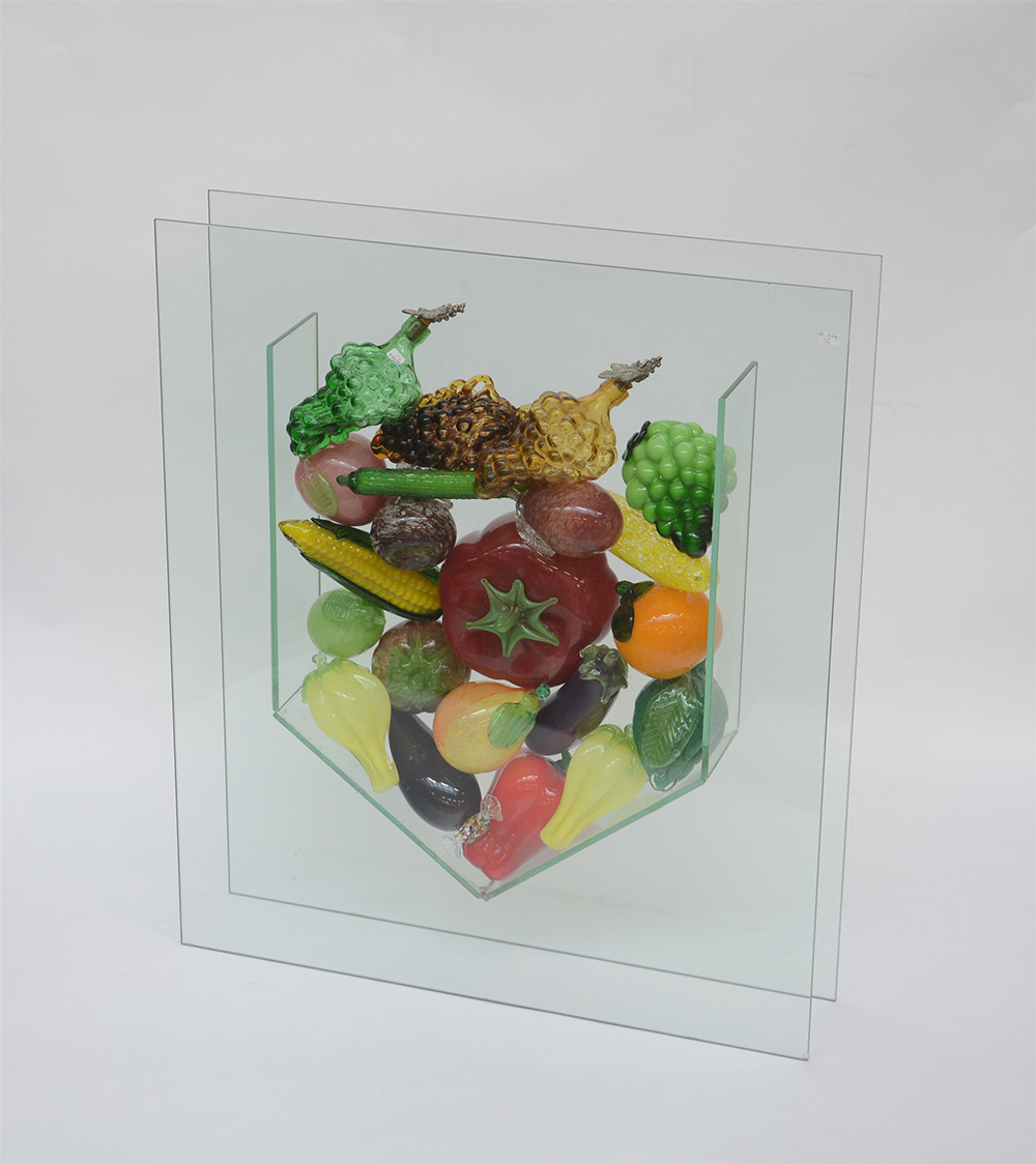 Ignoto "Composizione in teca con frutta" scultura in vetro policromo (difetti)