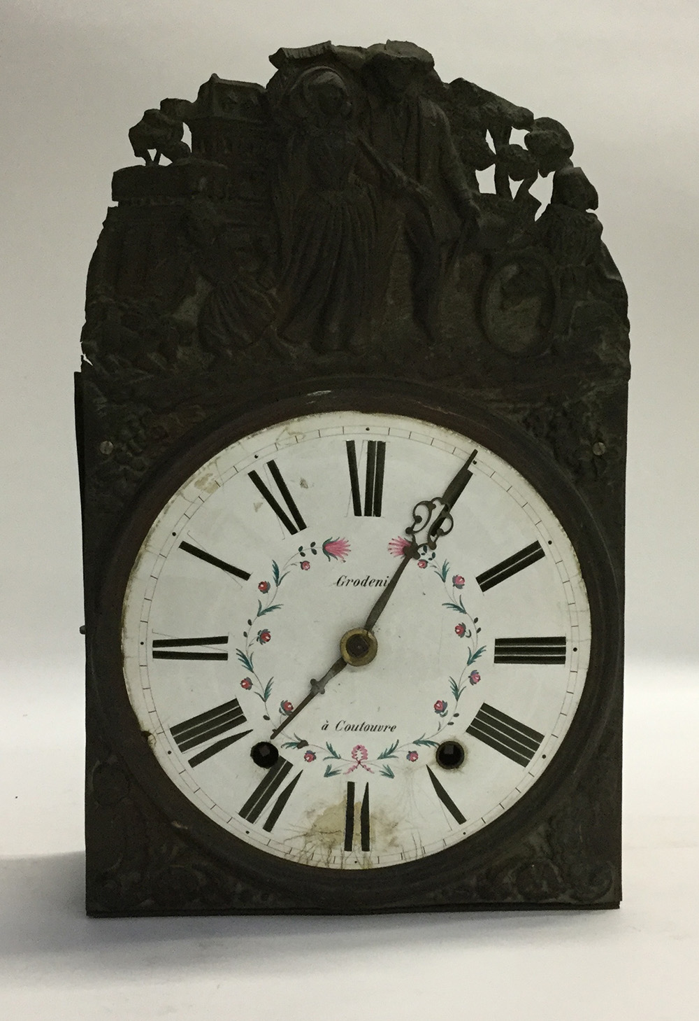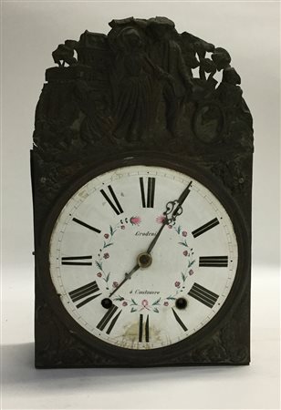 Pendola Morbier marcata Grondenis à Coutoure con quadrante in metallo smaltato a numeri romani circondato da una placca in ottone sbalzato raffigurante l'allegoria della famiglia. Carica delle ore e delle mezze con suoneria su campanello; scappamento ad ancora. Francia, seconda metà del secolo XIX (difetti, mancanze e restauri)
