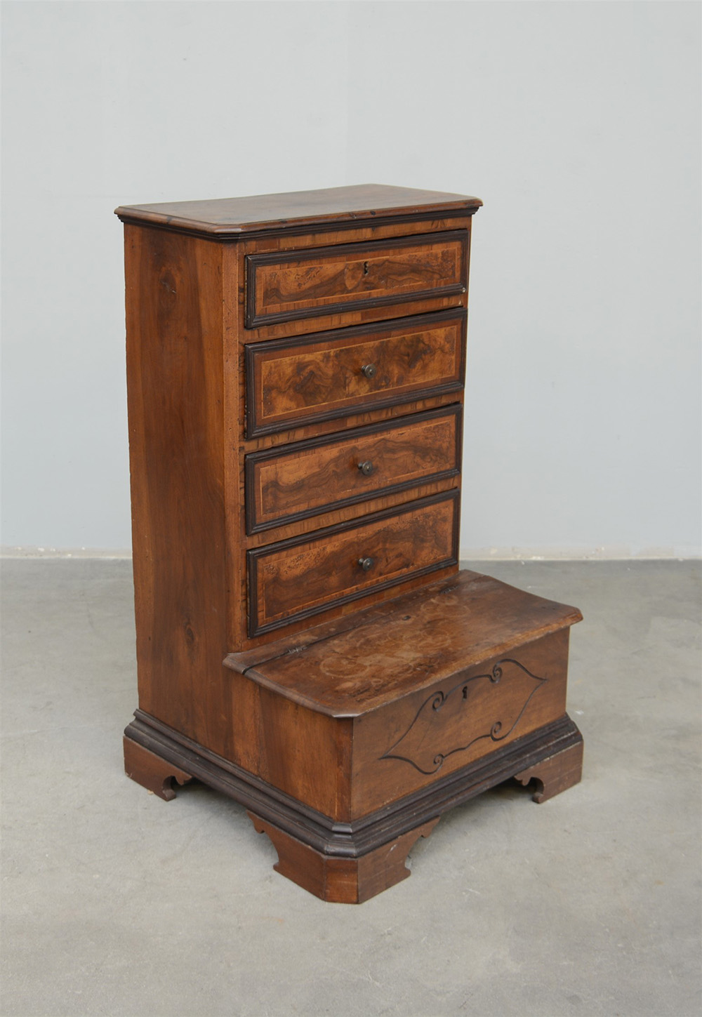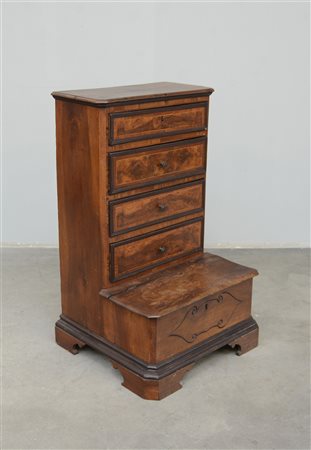 Antico inginocchiatoio a quattro cassetti incorniciati e filettati, predella...