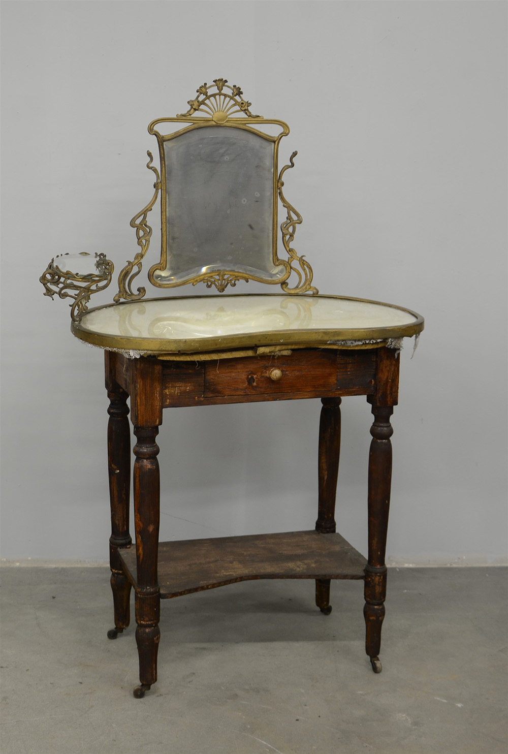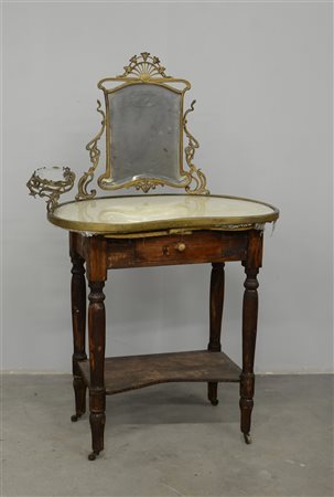 Toilette formata da un tavolino in legno dolce con cassetto e un piano a fagiolo in vetro sormontato da specchiera e vano porta spazzole, cornici in bronzo; fine secolo XIX (cm 81x140x51) (difetti e mancanze)