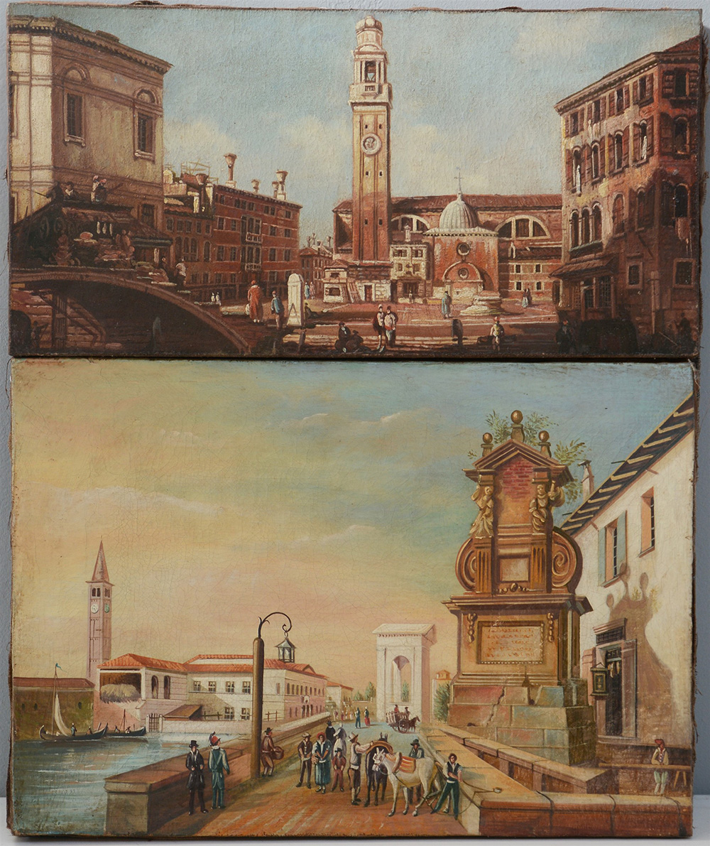 Lotto di due dipinti ad olio su tela raffiguranti scorci di città, autori e misure diverse (difetti)