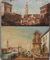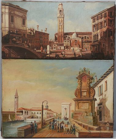 Lotto di due dipinti ad olio su tela raffiguranti scorci di città, autori e...