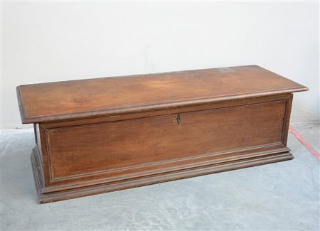 Antico cassone in noce con specchiature incorniciate, coperchio non coevo (cm 177x52x60) (difetti, mancanze e restauri)