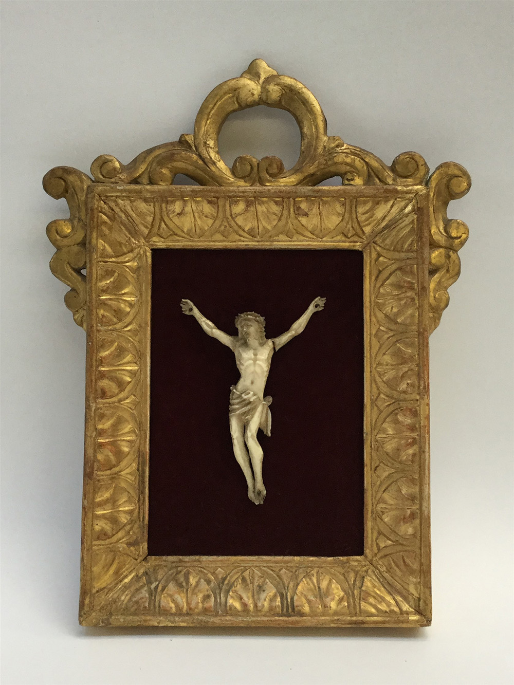 Piccola scultura in avorio raffigurate Cristo crocefisso applicato su...