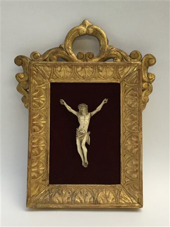 Piccola scultura in avorio raffigurate Cristo crocefisso applicato su pannello in velluto rosso e cornice in legno intagliato e dorato; prima metà del secolo XX (cm 22x29) (difetti)