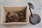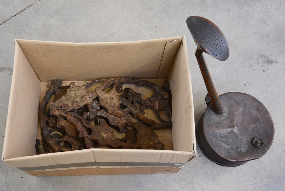 Cartone contenente numerosi fregi in ferro ed un annaffiatoio in rame (difetti)