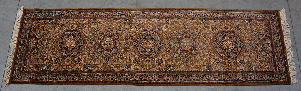 [Tappeti] Passatoia Kashmir, India, secolo XX. Disegno a piccoli medaglioni nei toni del beige (cm 311x92) (difetti)