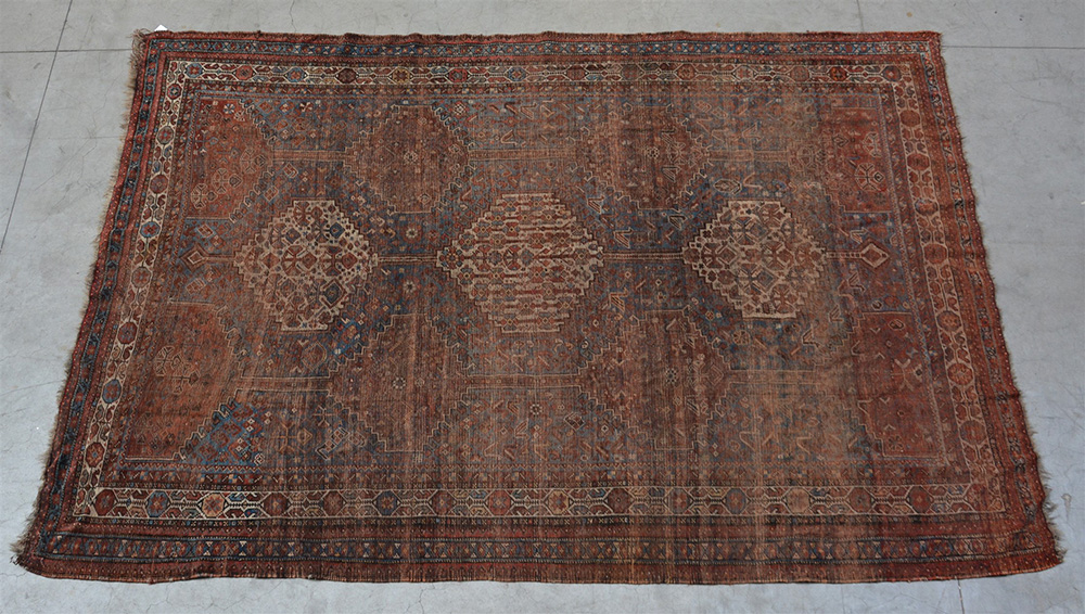 [Tappeti] Tappeto Kamseh, Persia meridionale, fine secolo XIX. Disegno a medaglioni su fondo policromo (cm 320x216) (difetti)