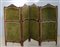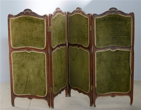Piccolo paravento a quattro ante in legno intagliato a motivi vegetali. Pannelli in stoffa (cm 110x180) (difetti)