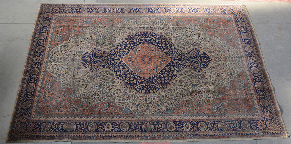 [Tappeti] Tappeto Shivas, Turchia, secolo XX. Disegno floreale con medaglioni rosa di forma ad ogiva su di un medaglione a fondo blu. Campo color lana naturale (cm 332x248) (difetti)