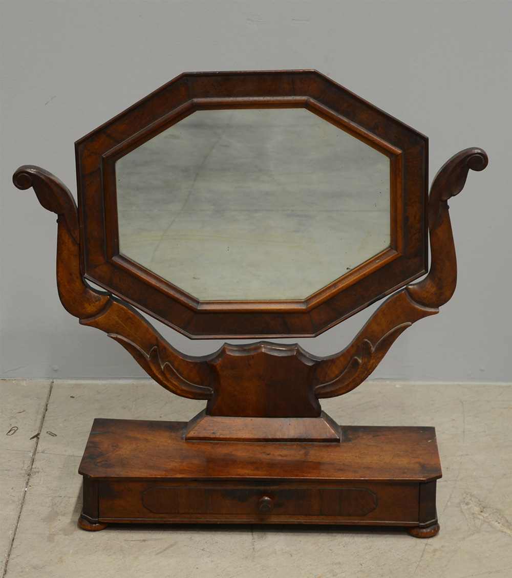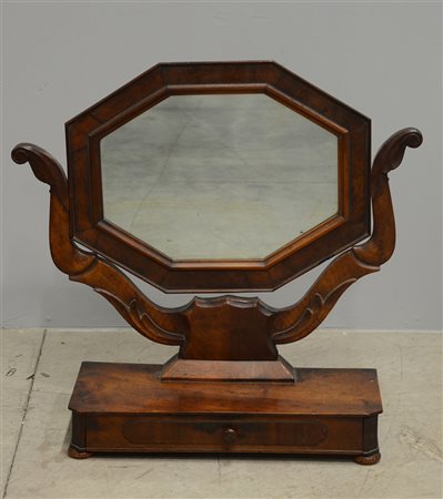 Specchiera da comò basculante lastronata in noce con specchio ottagonale e cassetto nella fascia. Fine sec. XIX (difetti)