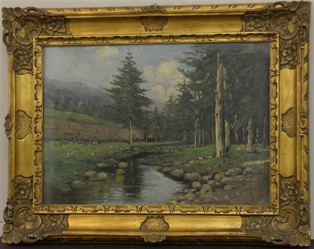 Ignoto "Paesaggio con torrente e abeti" 1953 (cm 50x70) firmato G. Piccinni e datato in basso a sinistra, in cornice (difetti)