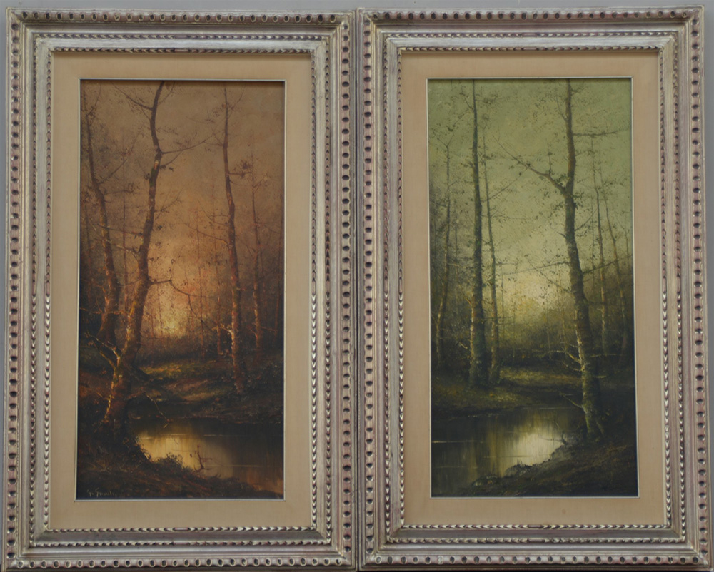 Ignoto "Tramonto nel bosco" e "Alba nel bosco" coppia di due olii su tela (cm 80x40) uno firmato G.Gnocchi in basso a sinistra, in cornice (difetti)