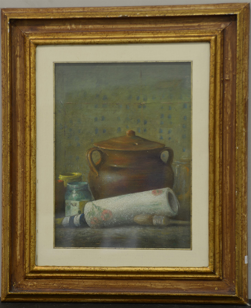 Massimo Callossi "Composizione in studio-oggetti da lavoro" olio su cartone telato (cm 40x30) firmato in basso a dstra, firmato e titolato al retro, in cornice (difetti)
