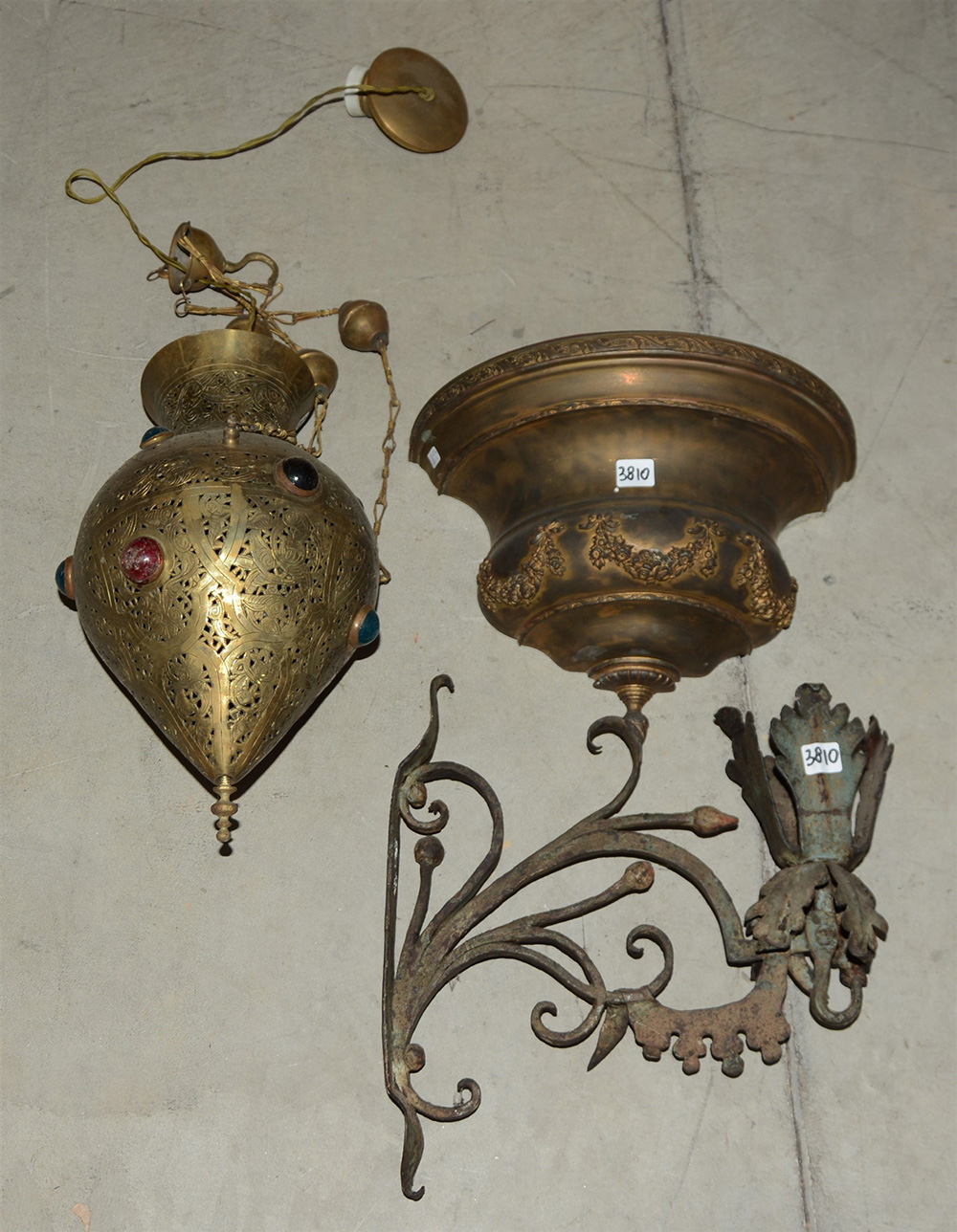 Lotto composto da un antico fregio porta cero in ferro battuto, una lampada di gusto mediorientale, ed una mensolina demi-lune (difetti)