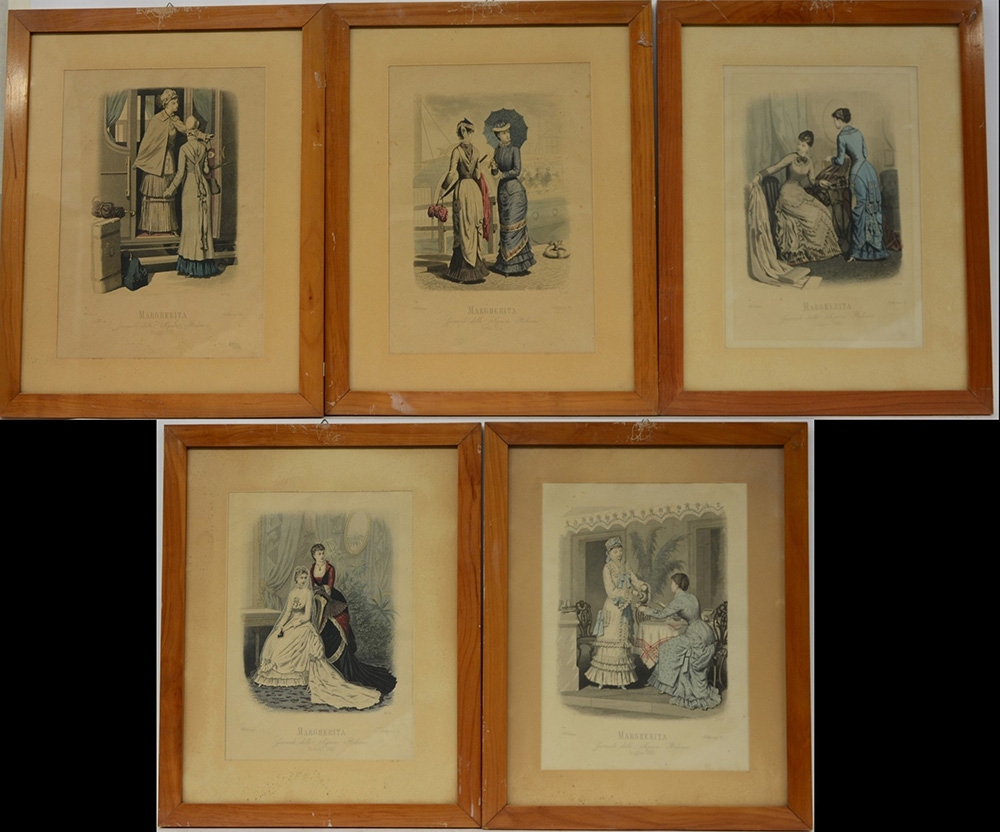 Gruppo di cinque litografie a colori raffiguranti vestiti di moda dell'inizio del secolo XX. In cornici