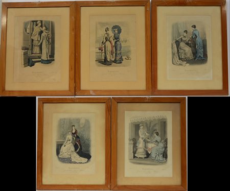 Gruppo di cinque litografie a colori raffiguranti vestiti di moda dell'inizio...