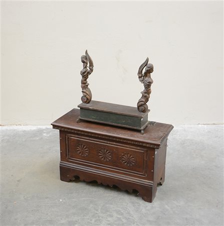 Lotto composto da un bauletto in legno intagliato e una struttura per psiche...