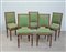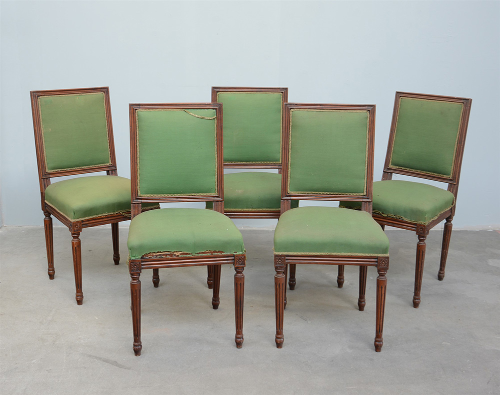 Gruppo di cinque sedie con gambe rastremate, seduta e dorsale rivestiti in tessuto verde (difetti)