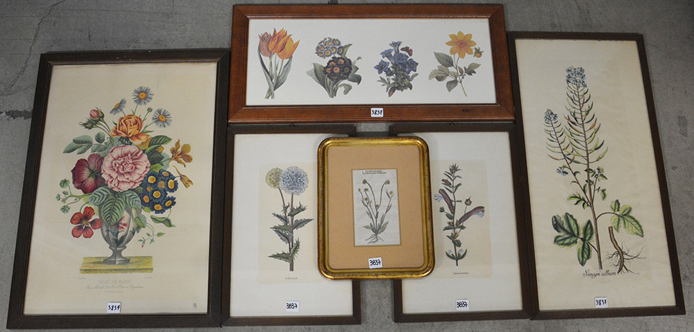 Lotto di sei stampe di diversa epoca e misure a soggetto botanico, in cornici (difetti)