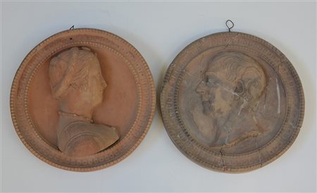 Coppia di bassorilievi in terracotta con ritratti di condottiero e gentildonna (d cm 46) (difetti e restauri)