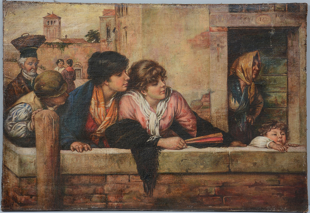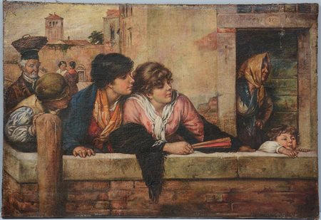 Ignoto "L'attenzione della madre" olio su tela (cm 56x83)(difetti)