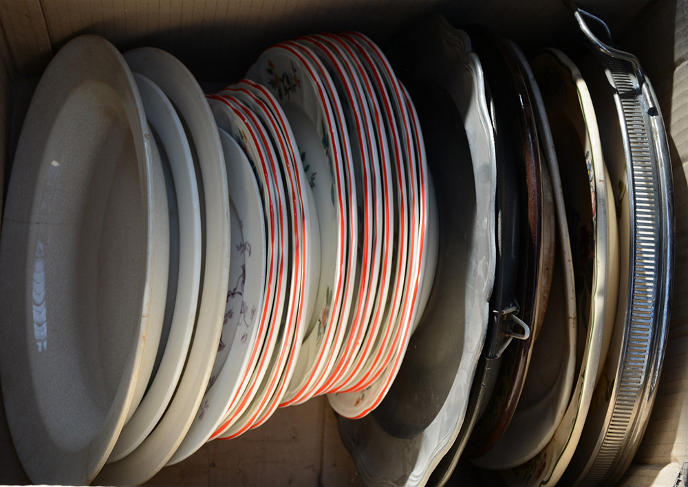 Cartone composto da numerosi piatti in ceramica e peltro (difetti)