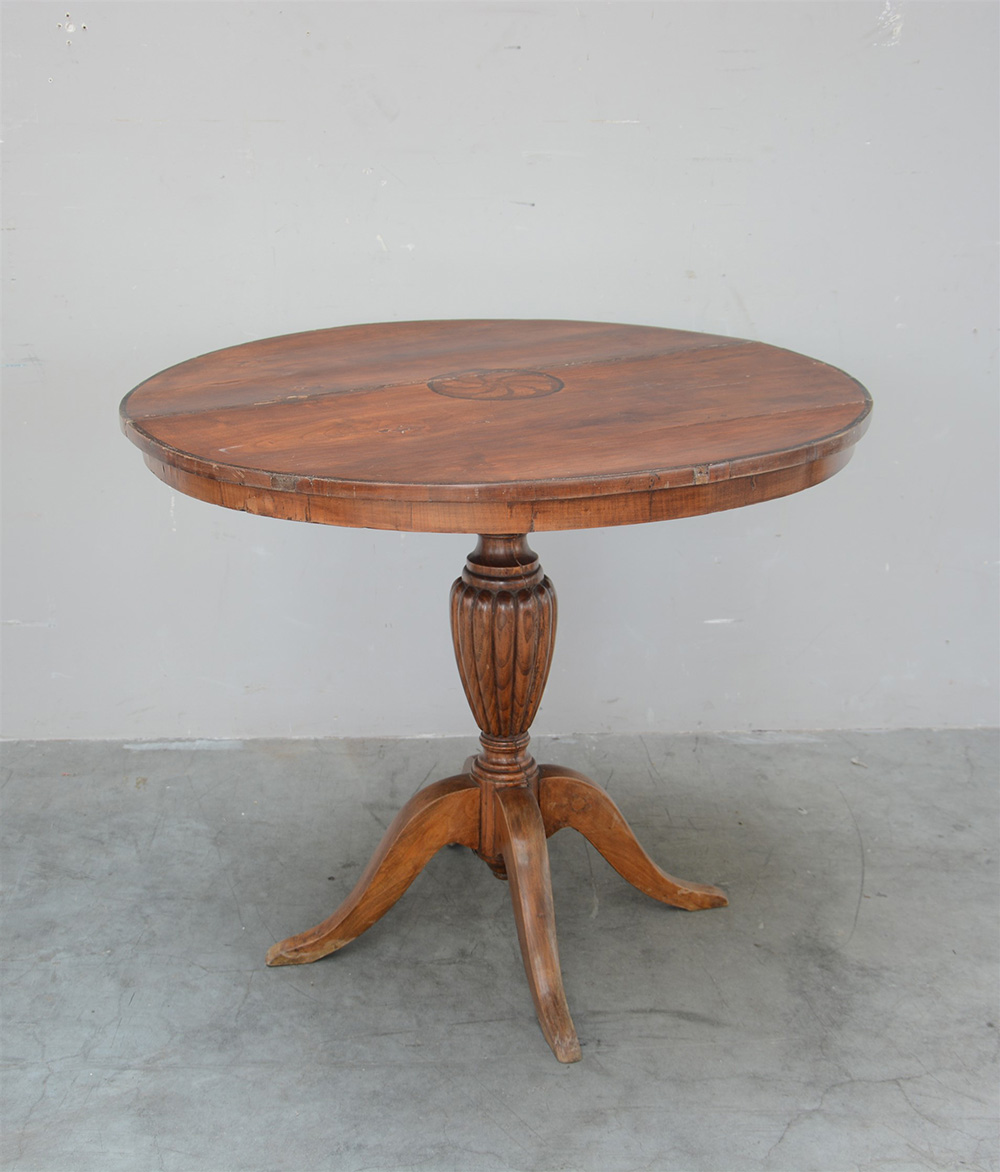 Tavolo con piano tondo intarsiato da rosone, gamba centrale scanalata poggiante su quattro piedi sagomati (d cm 93x h cm 78)(difetti)