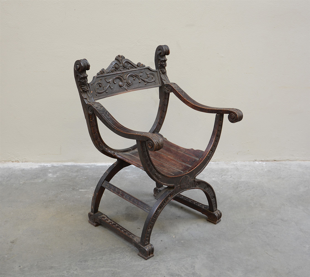 Poltroncina della fine del secolo XIX in legno intagliato a mascheroni e volute vegetali (difetti)