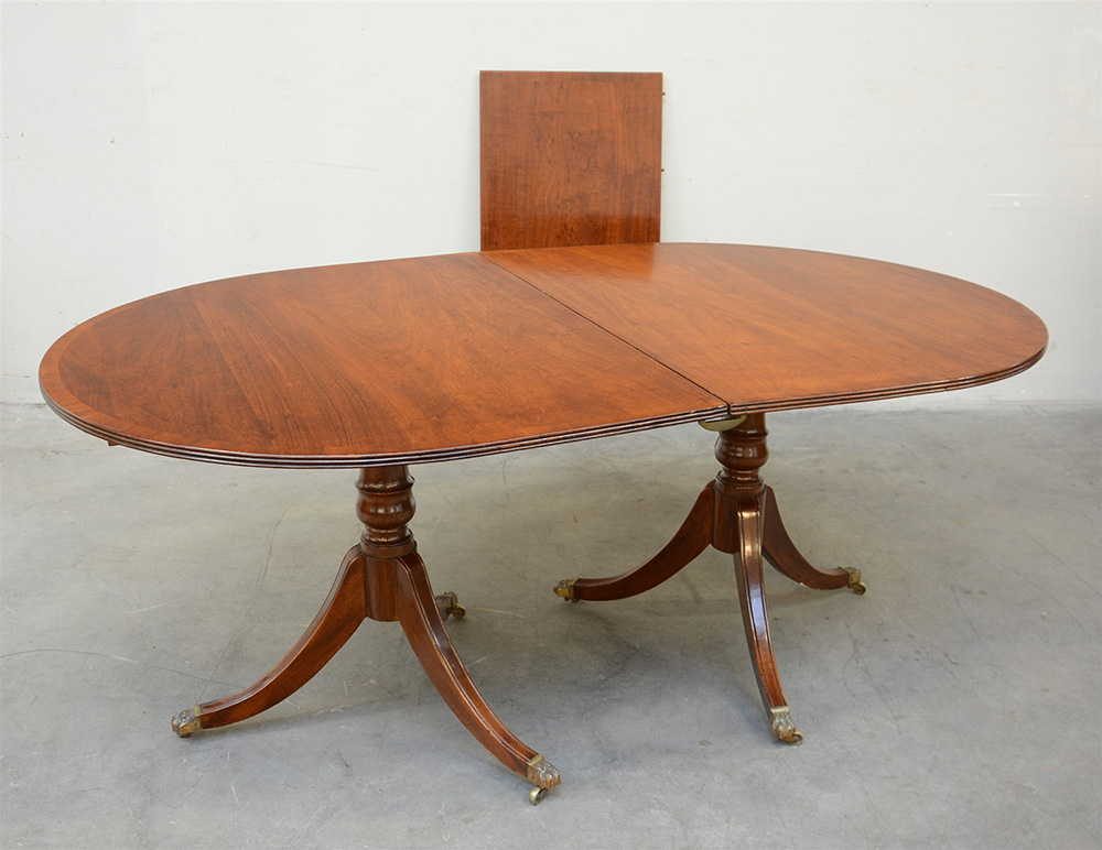 Tavolo ovale allungabile in mogano con gambe centrali tornite terminanti a tre piedi sagomati con rotelle in ottone. Inghilterra fine sec. XIX (cm 180x77x108)(munito di una prolunga) (difetti)