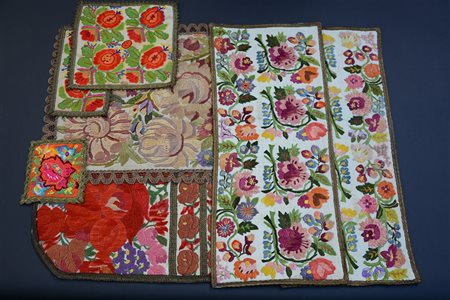 [Tappeti] Lotto composto da sette strisce di stoffa ricamata in seta policroma con decoro floreale di stile tirolese, bordati con vecchie passamanerie in metallo (max 72x32 cm) (lievi difetti)