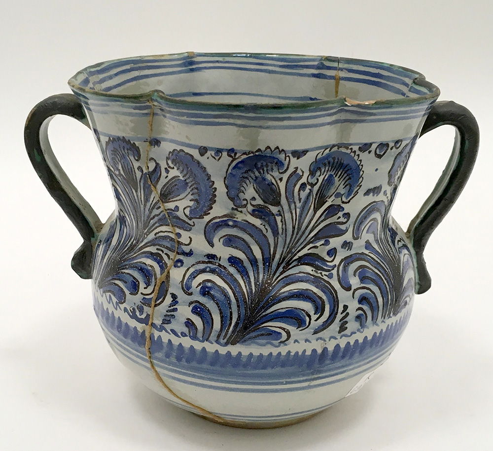 Vaso con bocca polilobata in maiolica, manifattura pugliese, sec. XVIII. Due manici a ricciolo. Decorazione a cespugli di garofani in monocromia blu contornati in bruno (h. cm 22) (rotture e restauri)