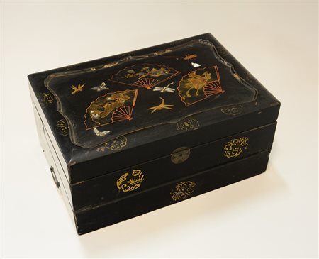 Manifattura giapponese sec. XIX. Scrittoio da viaggio in lacca decorato in oro con inserti in avorio e madreperla, (difetti)