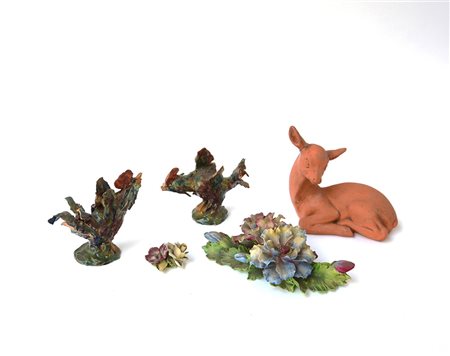 Lotto composto da due sculture in terracotta smaltata raffigurante galli di Matilde Magnaghi, una terracotta raffigurante un cerbiatto e due fiori