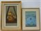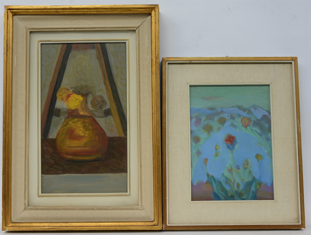 Lotto di due dipinti moderni ad olio raffiguranti paesaggio e vaso con fiori,...