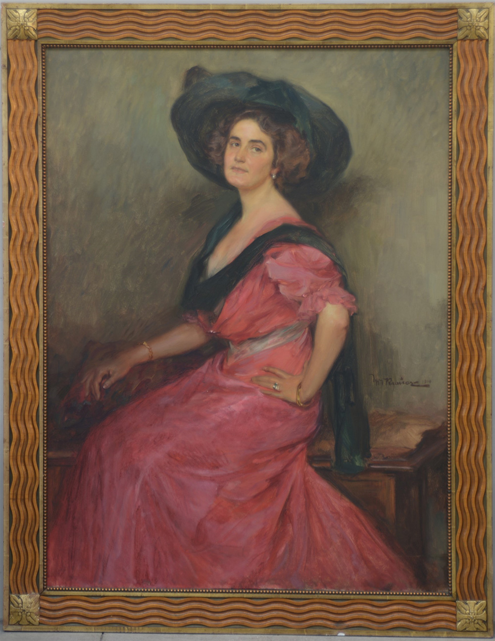Firma indecifrata "Ritratto di gentildonna con cappello" 1910 olio su tela (cm 140x105) firmato e datato in centro a destra, in cornice
