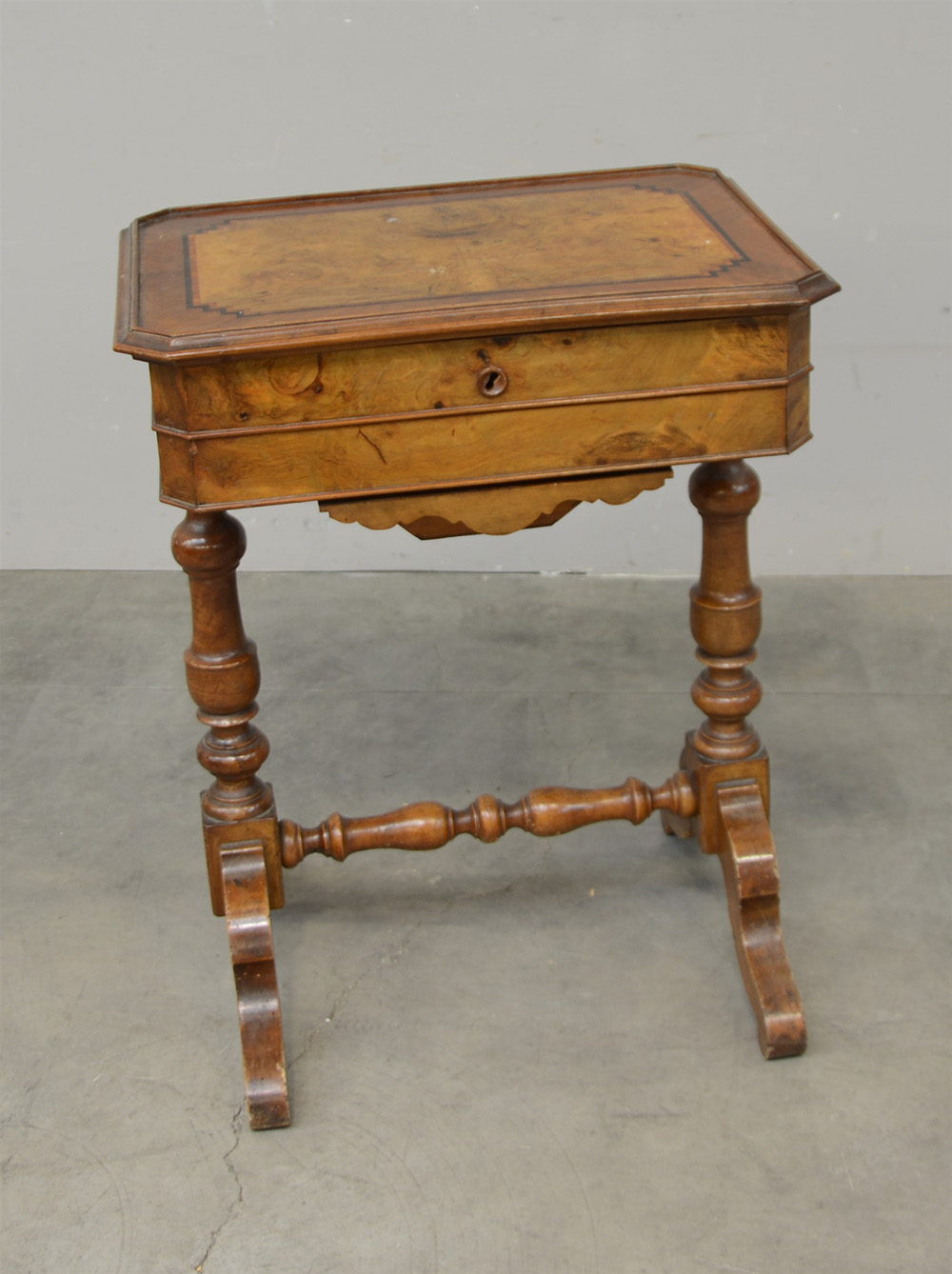 Tavolo da lavoro in noce e radica con piano apribile e cassetto nella fascia, gambe e traversa torniti. Sec. XIX (cm 58x73x44)