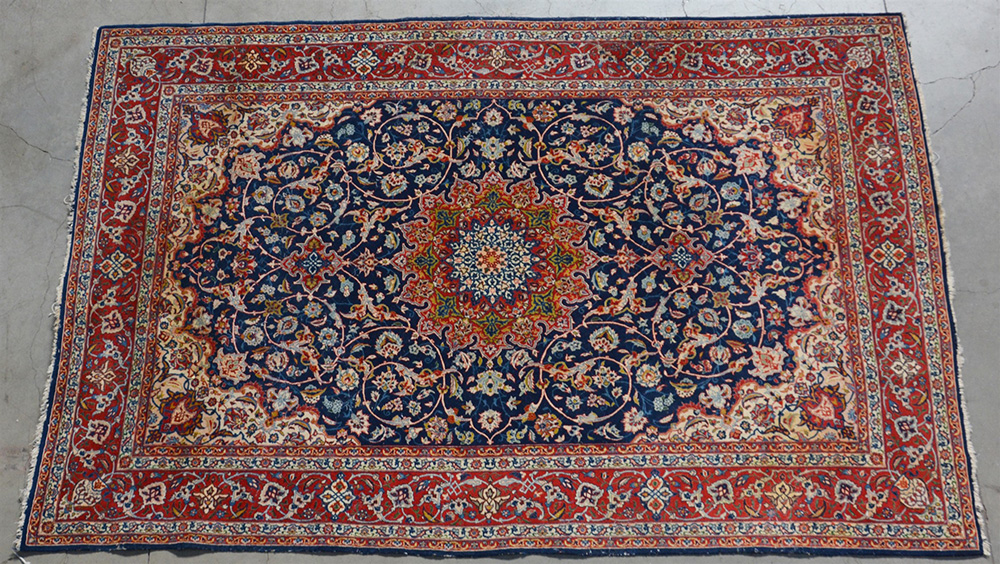 [Tappeti] Tappeto Isphahan, Persia, secolo XX. Disegno a medaglione rosso su fondo blu (cm 225x154)(difetti)
