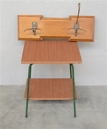 Lotto composto da un piccolo appendiabiti Liberty è un tavolinetto a due ripiani, in legno e metallo (difetti)