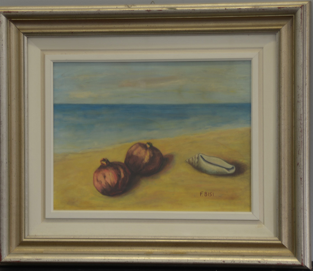 Fioretta Bisi. "Marina con melograni", 1978, acrilico su tela (cm 30x40) Etichette a retro