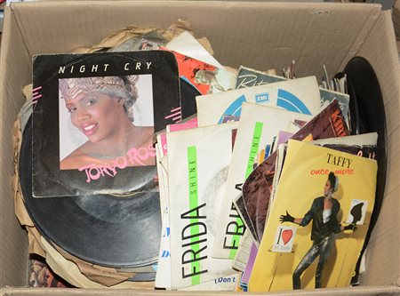 Cartone contenente numerosi dischi 33e 45 giri di diverso genere (difetti)