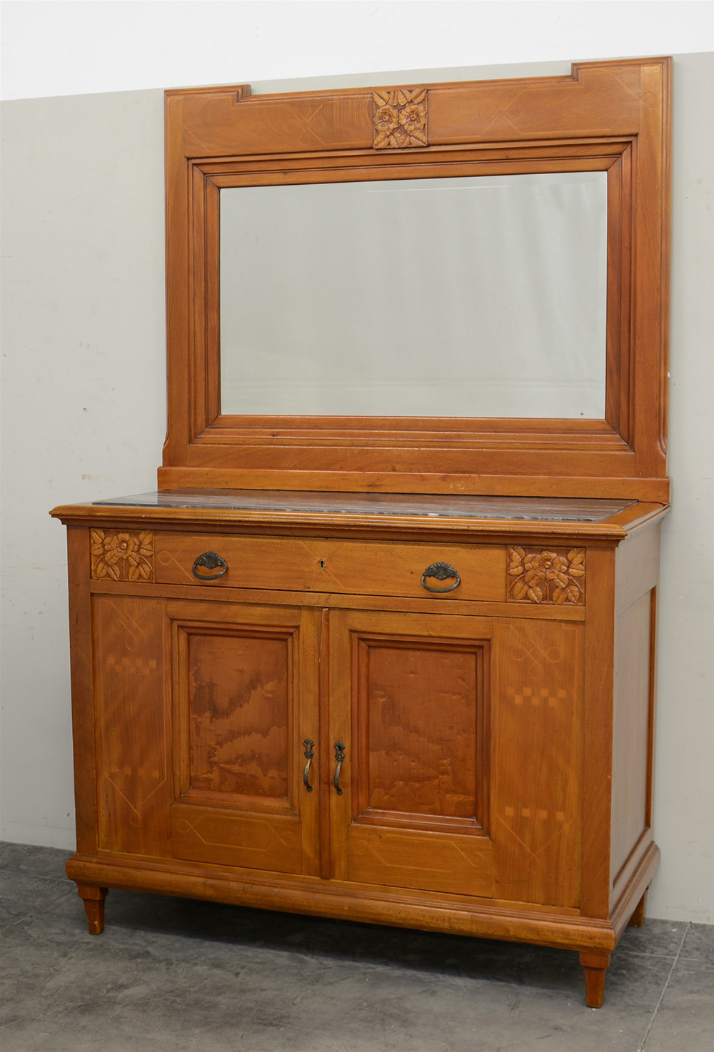 Comò con specchiera "Liberty" ad un cassetto e due sportelli in legno intagliato a fiori e foglie e filettato a motivi geometrici, piano in marmo. 1910 ca. (Cm 130x203x59)(difetti)