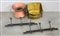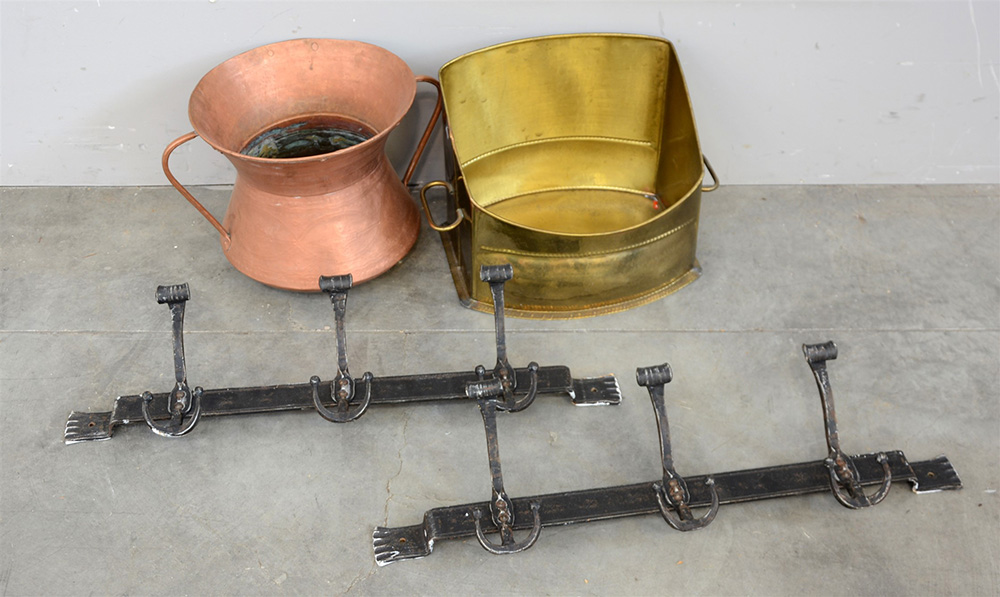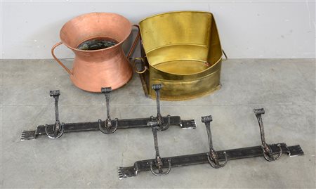 Lotto di un piccolo portacarbone in ottone, un contenitore biansato in rame e due piccoli appendiabiti in ferro battuto (difetti)