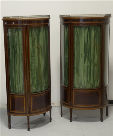 Coppia di vetrinette semicircolari ad un anta, lastronate e filettate, piedi rastremati, piani decorati da ringhierine in metallo traforato (cm 62x126x30)(difetti)
